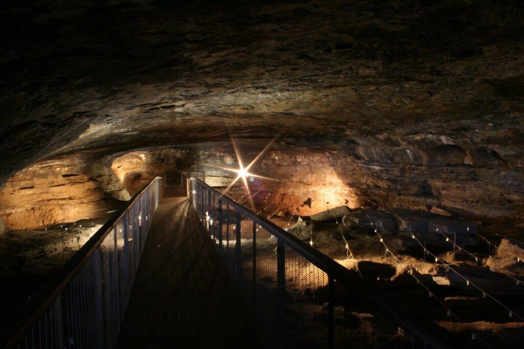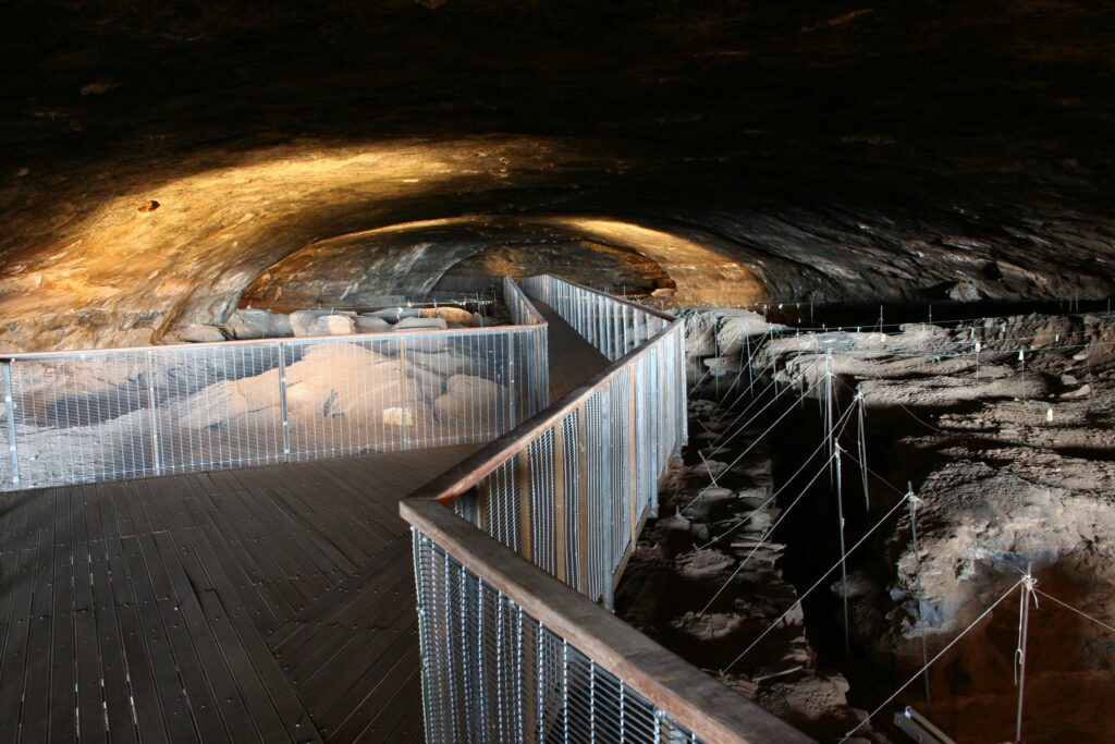 Upon entering the cave, visitors will encounter a massive stalagmite that began forming over 35,000 years ago and continues to grow today. The walls near the front of the cave are adorned with finger paintings of animals and geometric signs created by hunter-gatherers who lived in the cave until the 1800s.